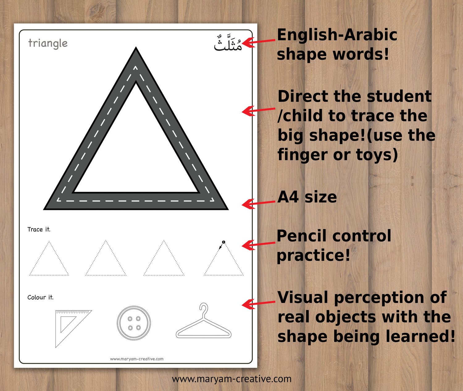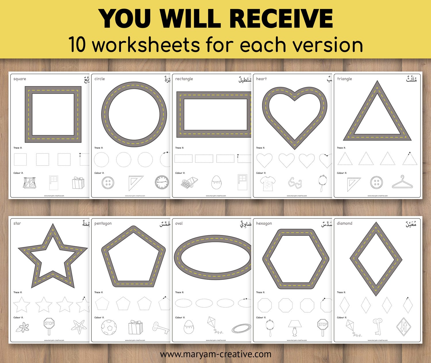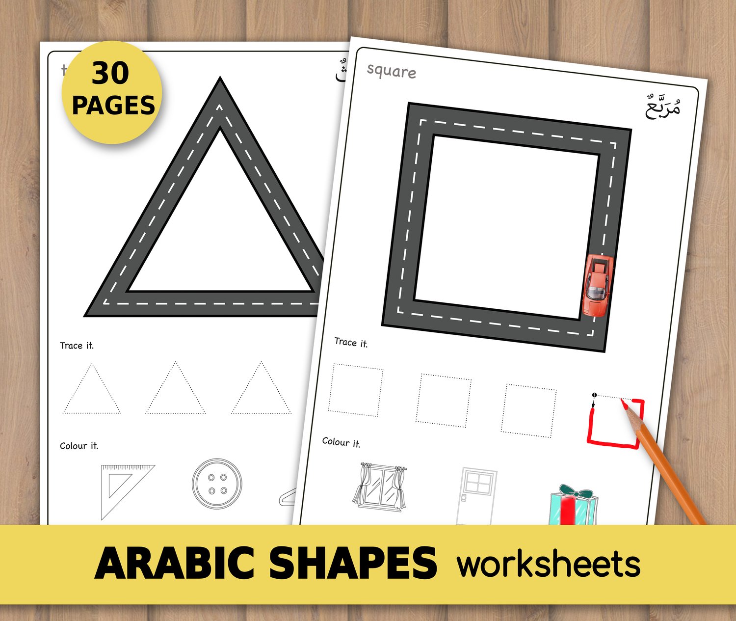 Arabic-English Shapes Worksheet Road, عربى – Instant Download