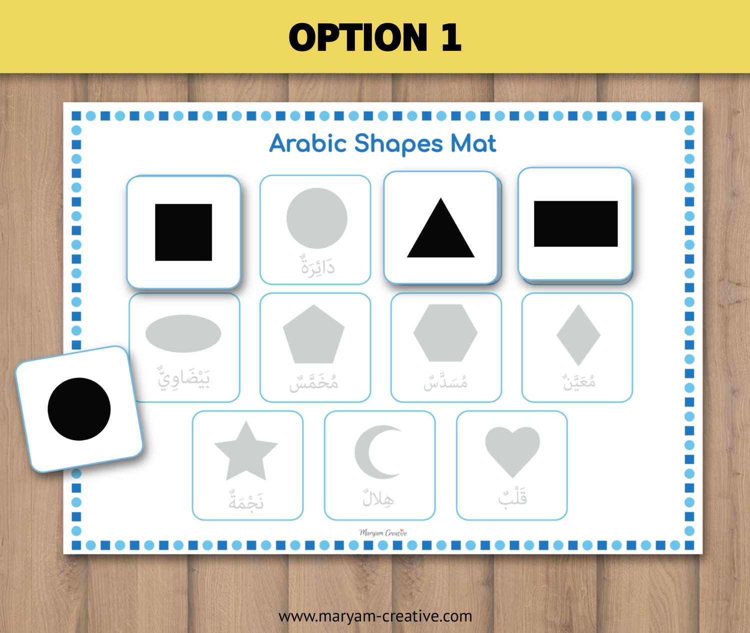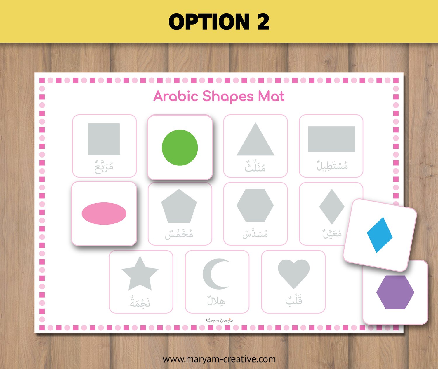 -Option 5: 11 cards with Arabic shapes word and english.