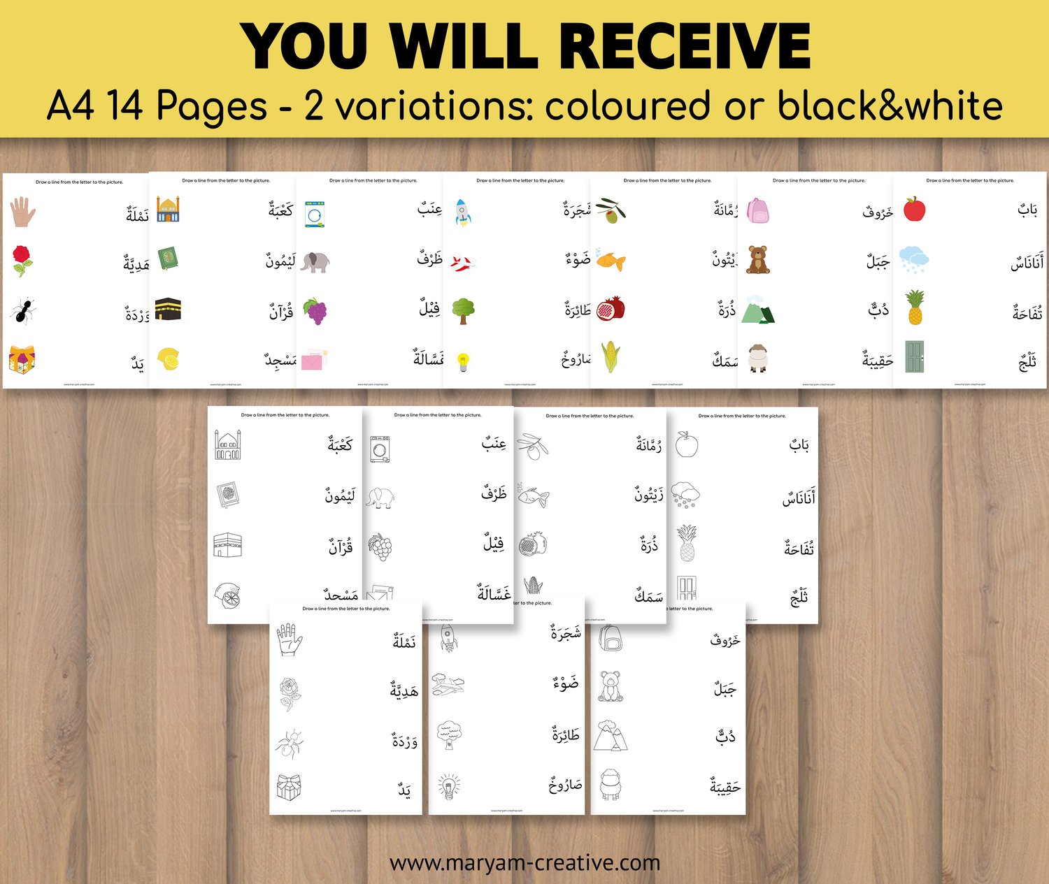- 2nd: 7 pages of Arabic letters to match with black and white pictures (SAVE INK)