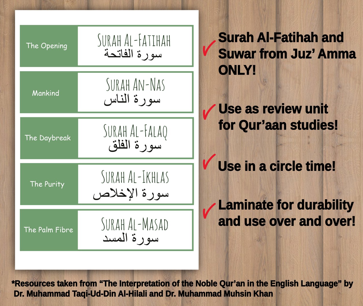 On top of the mats, use the long cards with the name of the verses/suwar in English-Arabic that the student is learning. On the bottom, place the cards that have the number of the verses/suwar that match with the ones that the student is learning, in English-Arabic and the place where it was revealed (Makki- Makkah or Madani-Madinah).