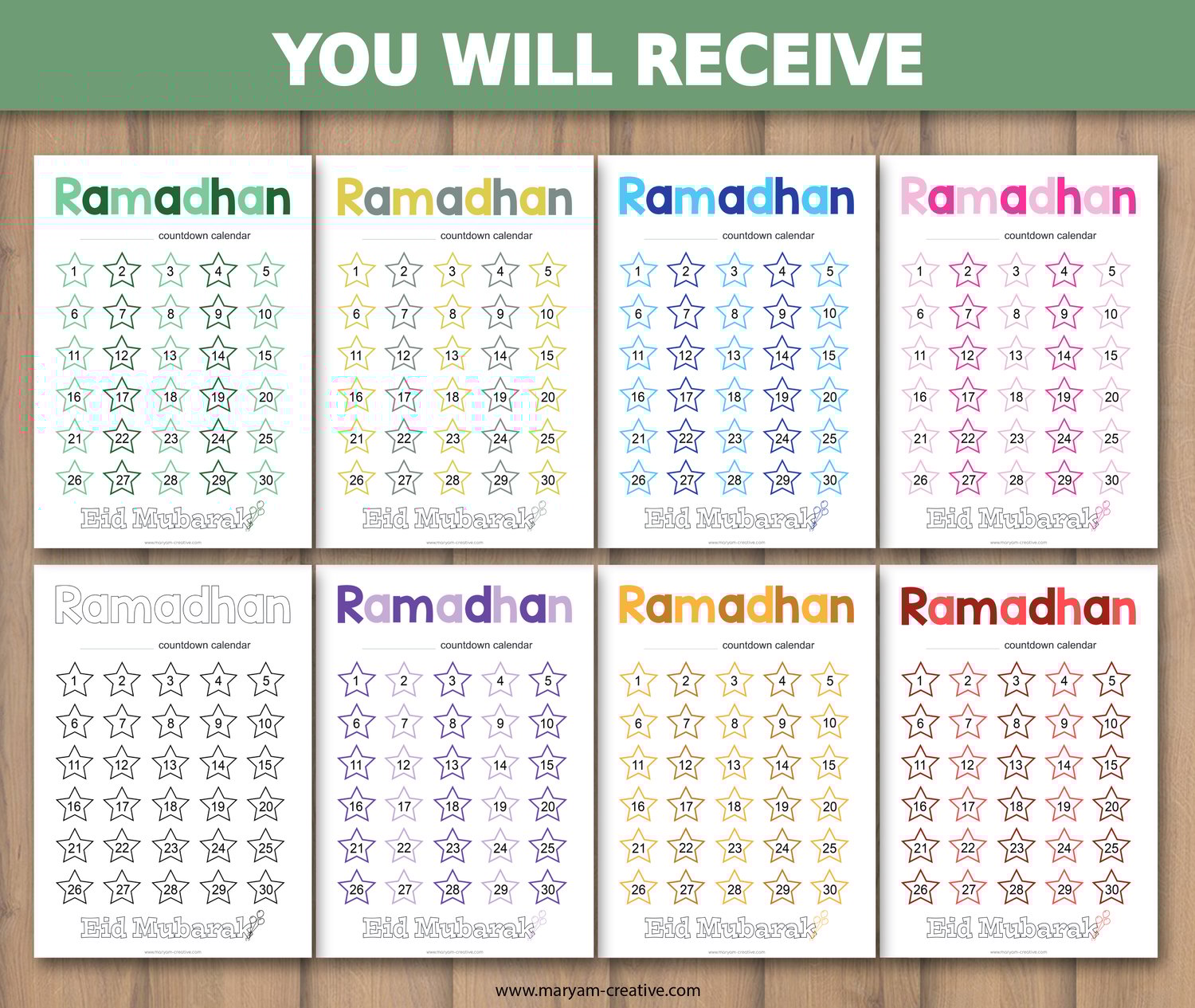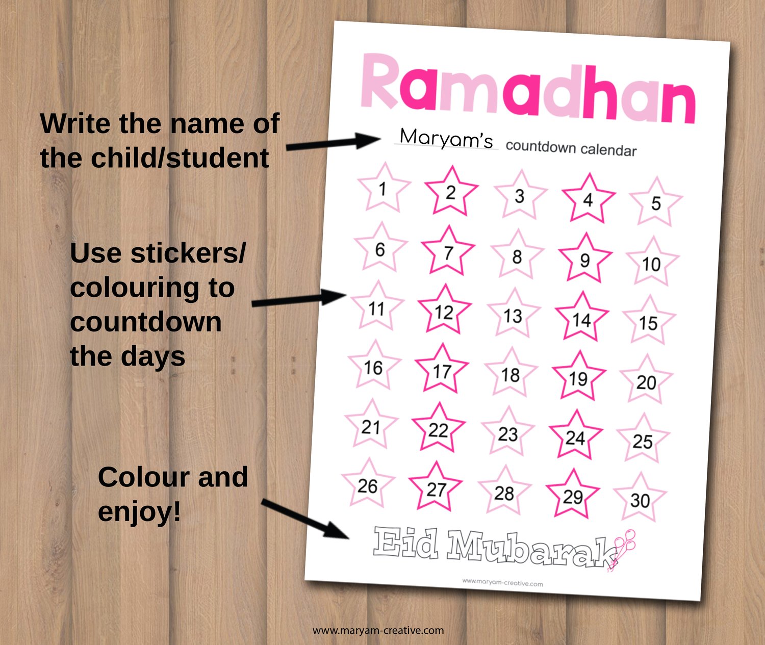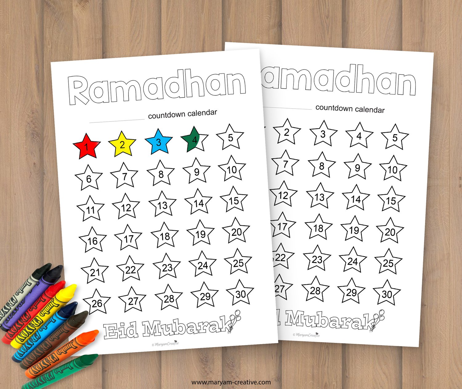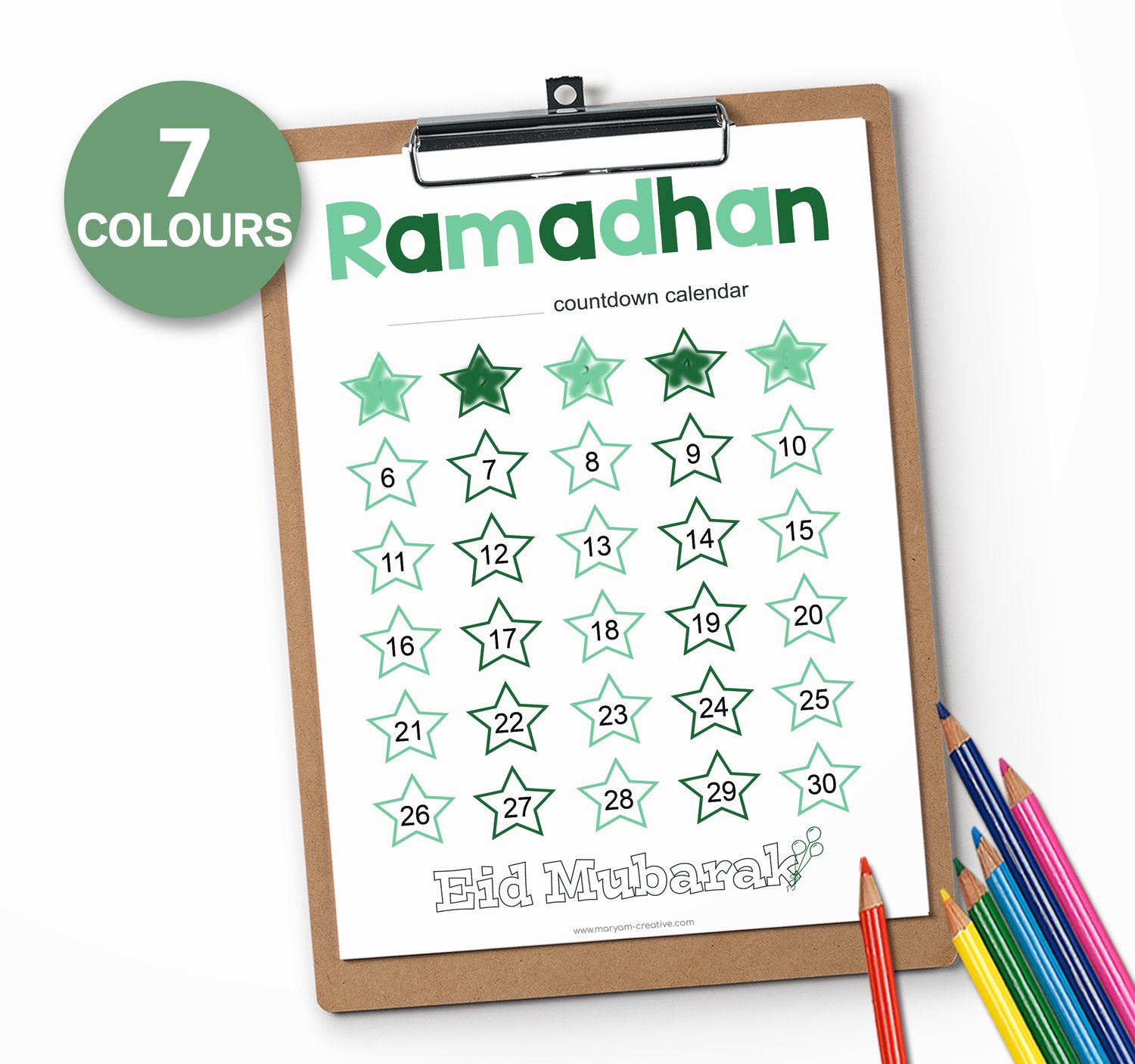 Ramadhan calendar colourful countdown days, Eid – Instant download